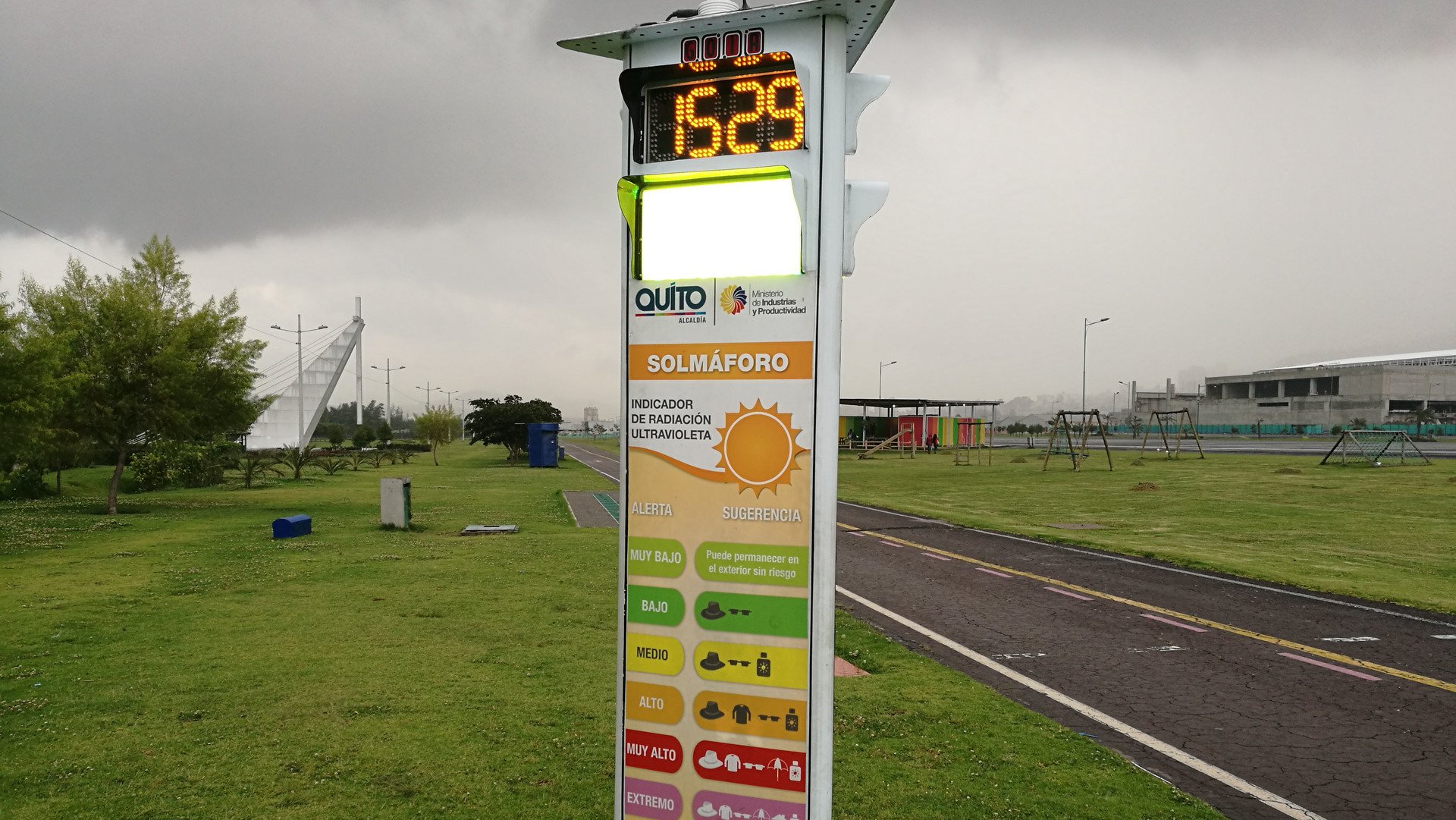 Pero el pasado domingo 12 de noviembre no fue así, el mismo 'solmáforo', uno de los tantos instalados en los principales parques de Quito para medir y notificar a los transeúntes sobre los rayos UV, se veía de color morado, lo que indicaba que la radiación estaba en un punto "extremo" y, por ende, era mejor resguardarse.