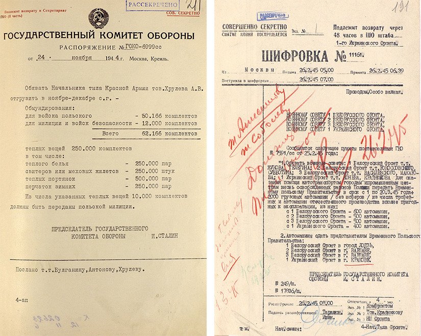 Según los documentos, la URSS proporcionó a la población polaca de las zonas liberadas "alimentos, suministros médicos, vehículos, combustible y materias primas para las empresas industriales". La asistencia provino de las reservas materiales del Ejército Rojo soviético y de los comisariatos del pueblo de la región, según informa el Ministerio de Defensa en un comunicado.