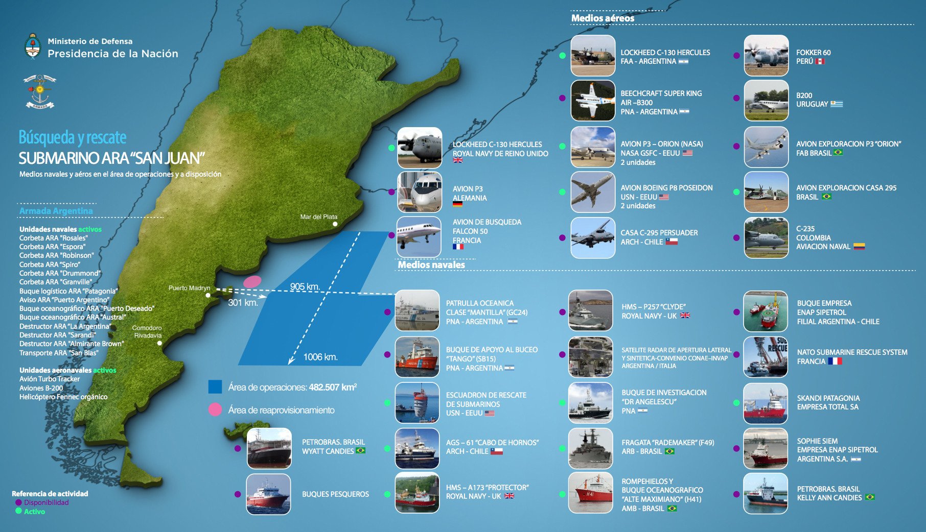 El Ministerio de Defensa argentino informó que se establecieron 15 medios aéreos y 17 navales para rastrillar un área de operaciones de 482.507 kilómetros cuadrados; todo esto dentro del plan SARSUB (Búsqueda y Rescate de Submarinos, por sus siglas en inglés).