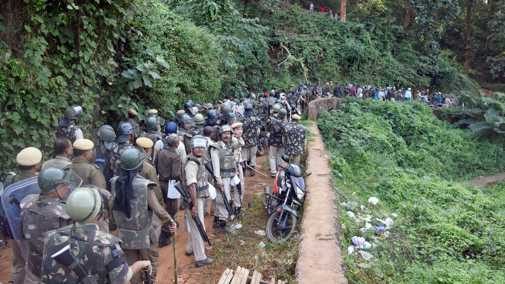 Aparte de los animales, los agentes de la ley también usaron buldóceres durante el desalojo. Los residentes del asentamiento respondieron a estas medidas lanzando piedras, por lo que los policías acudieron al uso del gas lacrimógeno. Según el comisionado policial Hiren Nath, al menos cinco civiles resultaron heridos durante el operativo.