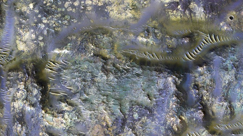 A mediados de este año, la misión de reconocimiento orbital de Marte obtuvo una imagen infrarroja de un cráter en ese planeta y captó unas formas características formadas por el impacto de materiales contra el suelo. Los colores indican la presencia de diferentes rocas y minerales, incluidos ejemplares ricos en hierro, como el olivino y el piroxeno.
