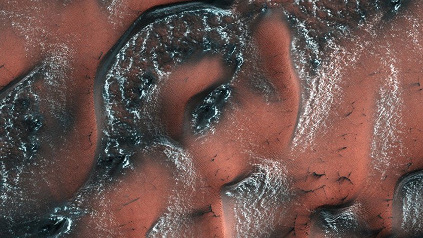 Al llegar la primavera, la superficie cubierta de nieve comienza a cambiar de forma por el calor del Sol, aunque se trata de dióxido de carbono, no agua congelada.