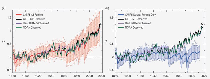 Sin embargo, el gráfico de la derecha muestra cómo la concentración de gases de efecto invernadero no habría aumentado en la atmósfera desde el siglo XX si los humanos no hubiéramos habitado la Tierra, con apenas variaciones provocadas por erupciones volcánicas y pequeños cambios de energía solar. La línea azul representa la dinámica de la temperatura promedio anual desde 1880 a 2016, y como puede apreciarse, no habría variado significativamente.