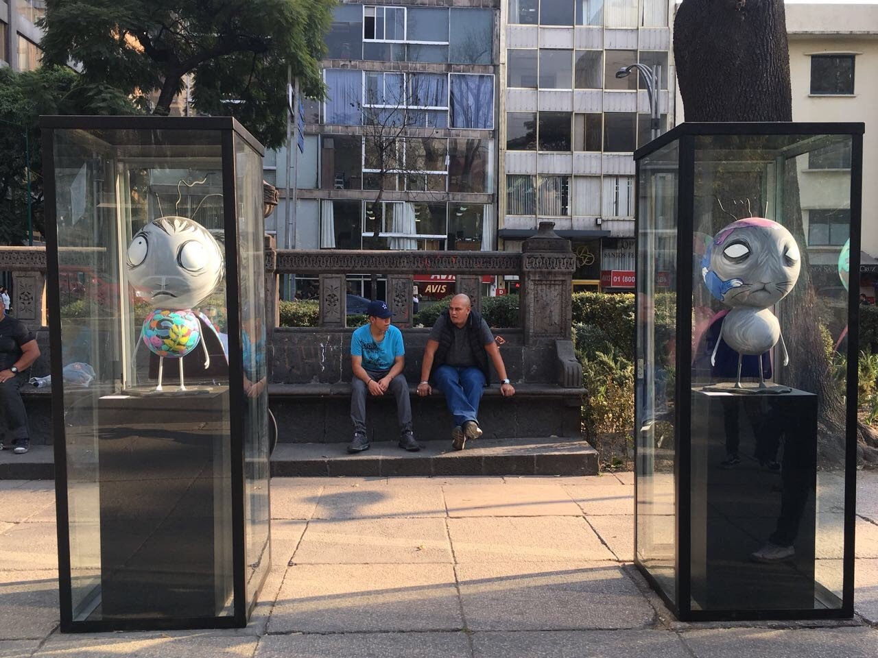 Como si de una conversación artística se tratara, la muestra de Burton también fue a la calle. En el Paseo de la Reforma, una de las zonas más emblemáticas de Ciudad de México, varios 'Stain boy' posan con atuendos que distan de la monocromática imaginación de su creador.