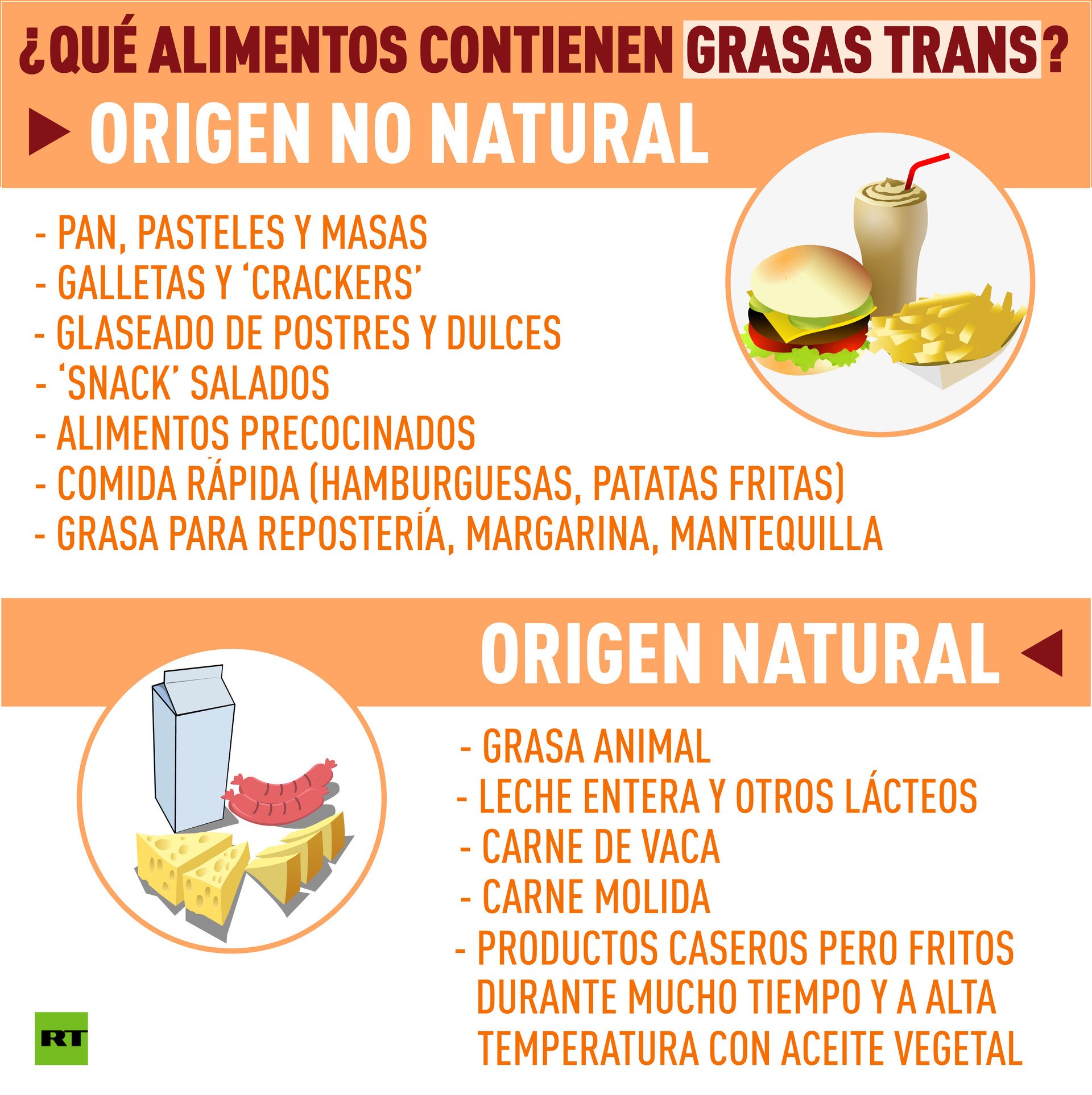 El problema radica en la abundancia de grasas trans, que se pueden hallar en numerosos productos de consumo diario, tanto de origen natural como procesados, aunque estos últimos son mucho más peligrosos. Las grasas para repostería, margarina o masa, incluida la que se usa en platos precocinados empanados, son los alimentos menos indicados.