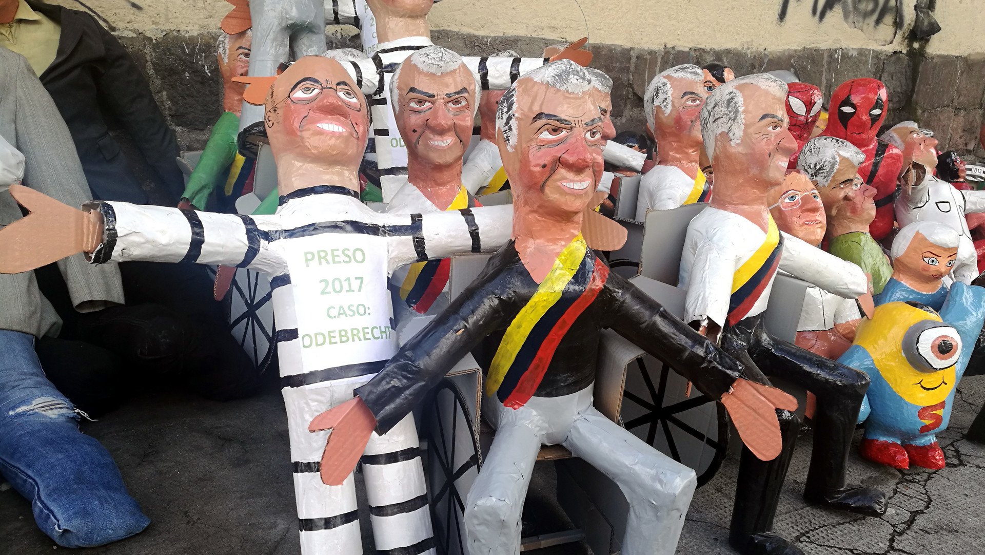 Gabriela Almeida, que elabora y vende los 'años viejos' en la calle Emperador Carlos V de Quito, asegura que este año, los políticos más demandados para ser quemados son el vicepresidente de la República, Jorge Glas, que fue condenado a 6 años de prisión por el sonado caso de Odebrecht; y el mismísimo presidente, Lenín Moreno, a quien le incluyen la silla de rueda en su representación.