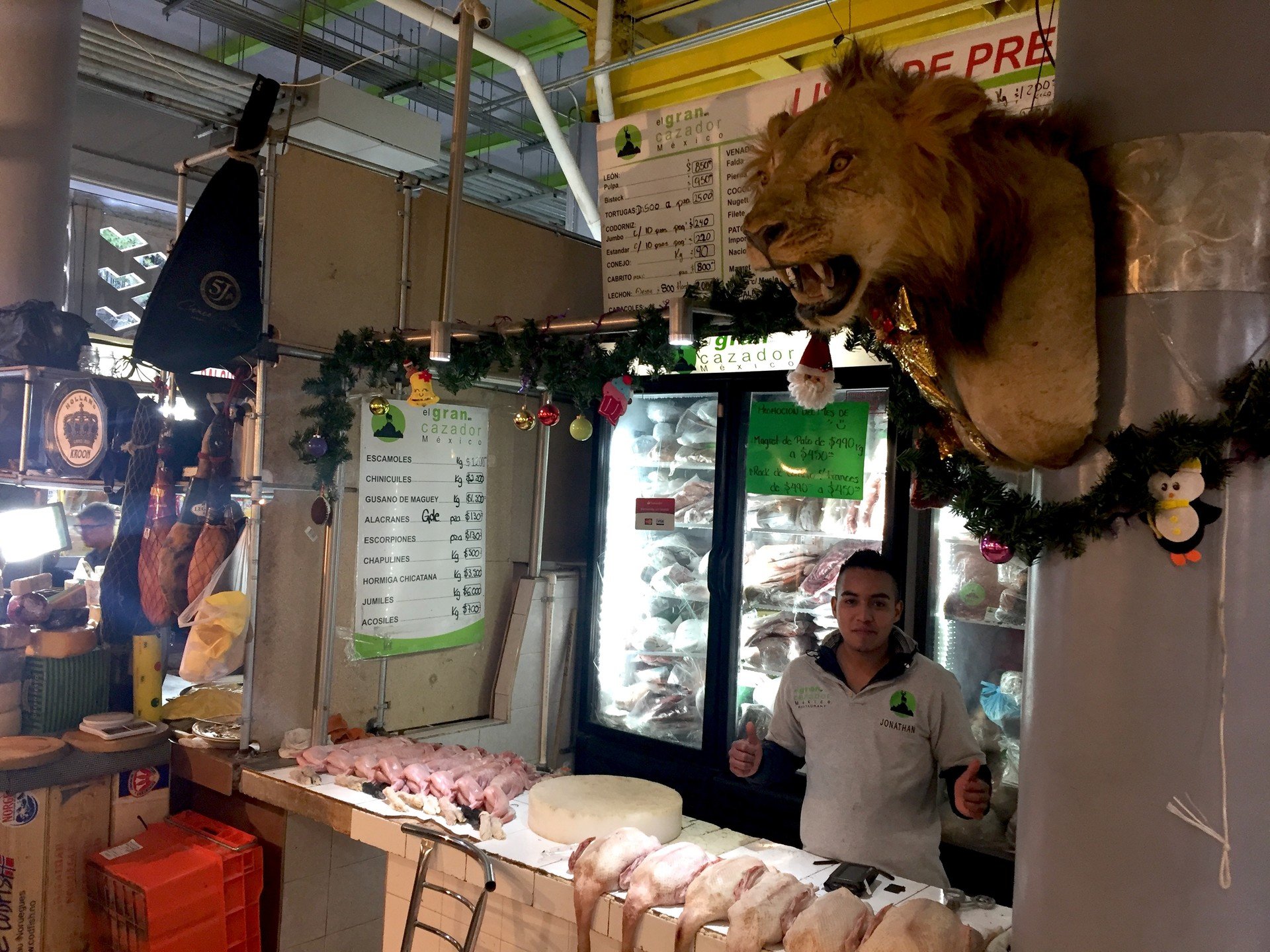 Se trata del remodelado Mercado de San Juan Pugibet, uno de los lugares más populares y frecuentados de Ciudad de México, donde los más exigentes comensales y cocineros acuden para comprar las carnes más exóticas. La oferta incluye fiambres de león, de cocodrilo, de jabalí, de jirafa. Y sí, es legal.