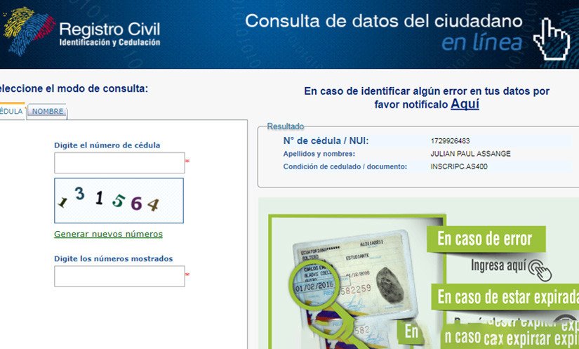 Los datos personales de Julian Assange se encuentran en la base de datos del Registro Civil de Ecuador e incluyen un documento de identidad con ese número.