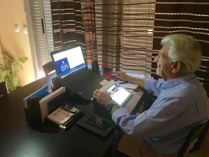 Como buen internauta, don Manuel tiene a mano todos los instrumentos de navegación que necesita. En su escritorio utiliza una tablet para tuitear y a la vez tiene a mano un ordenador portátil permanentemente conectado a la web de la Real Academia Española (RAE), cuyo diccionario consulta escrupulosamente cada vez que tiene alguna duda ortográfica, porque no quiere cometer faltas en sus tuits.