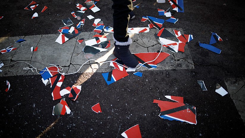 Al otro lado de la calle, cerca de 150 miembros de grupos conservadores realizaron su propia protesta: algunos rompieron una bandera de Corea del Norte, una bandera unificada y retratos del líder norcoreano Kim Jong-un.