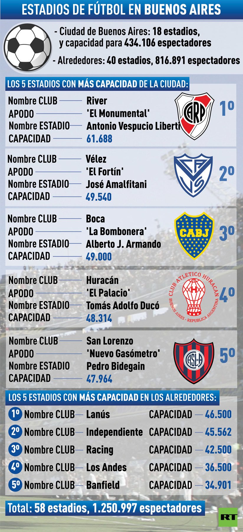 En aquella urbe se destacan los dos equipos más populares, River y Boca, cuyos escenarios pueden albergar a 61.688 personas en el 'Monumental' y 49.000 en la 'Bombonera', respectivamente, según las propias instituciones. También está San Lorenzo, uno de los 'cinco grandes' argentinos, que en el 'Nuevo Gasómetro' puede recibir a 47.964 hinchas, y su clásico rival, Huracán, que soporta hasta 48.314 simpatizantes en el 'Palacio'.