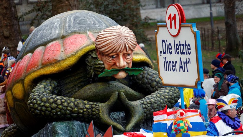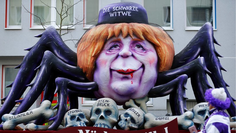 La canciller alemana Angela Merkel tampoco se ha librado de la burla carnavalesca y en Düsseldorf se la pudo ver caracterizada como una gran araña viuda negra rodeada de los restos óseos de sus adversarios, junto a un letrero en el que se leía "El siguiente, por favor". En Mainz se la representó como una especie de reptil gigante con el cartel: "El último de su especie".