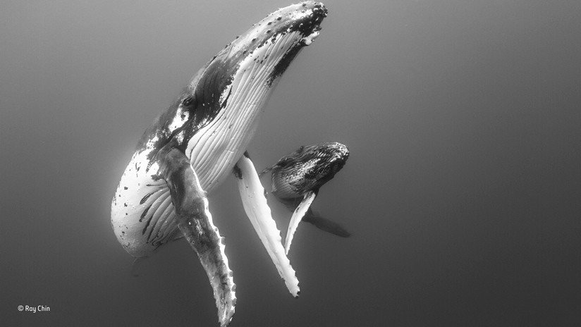 El fotógrafo Ray Chin presentó esta imagen en blanco y negro para destacar la sencillez de la escena, en la que una ballena jorobada y su cría nadan en las cálidas aguas próximas a las islas de Vava'u (Tonga).