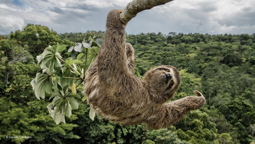 Este perezoso colgado de un árbol yagrumo —'Cecropia peltata'— en la selva atlántica protegida del sur de Bahía (Brasil) fue inmortalizado por Luciano Candisani.