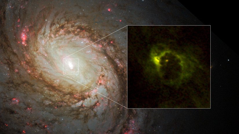 En el ALMA, esos científicos observaron la galaxia espiral M77, ubicada en la constelación de China, a 47 millones de años luz de la Tierra. En su centro, los investigadores detectaron una estructura de gas compacta con un radio de 20 años luz que estiman que gira en torno a un agujero negro supermasivo.