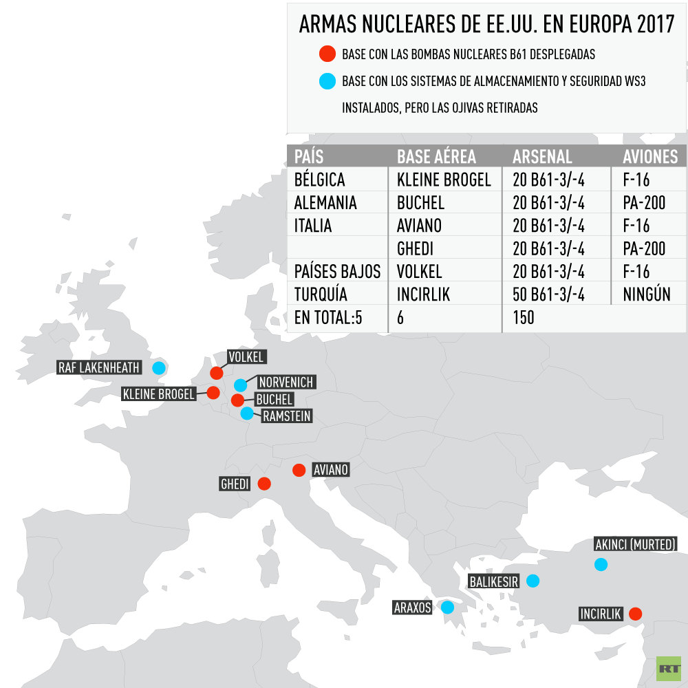 Aproximadamente una tercera parte de las bombas en cuestión puede encontrarse bajo control conjunto de jefes militares de EE.UU. y de la OTAN en la base aérea de Incirlik, en Turquía. Se trata de un emplazamiento que estuvo bloqueado y desconectado de la red eléctrica mientras en ese país se produjo y aplastaba la sublevación militar de 2016. El oficial turco a cargo del mando de esa base fue posteriormente arrestado por haber participado en el complot.