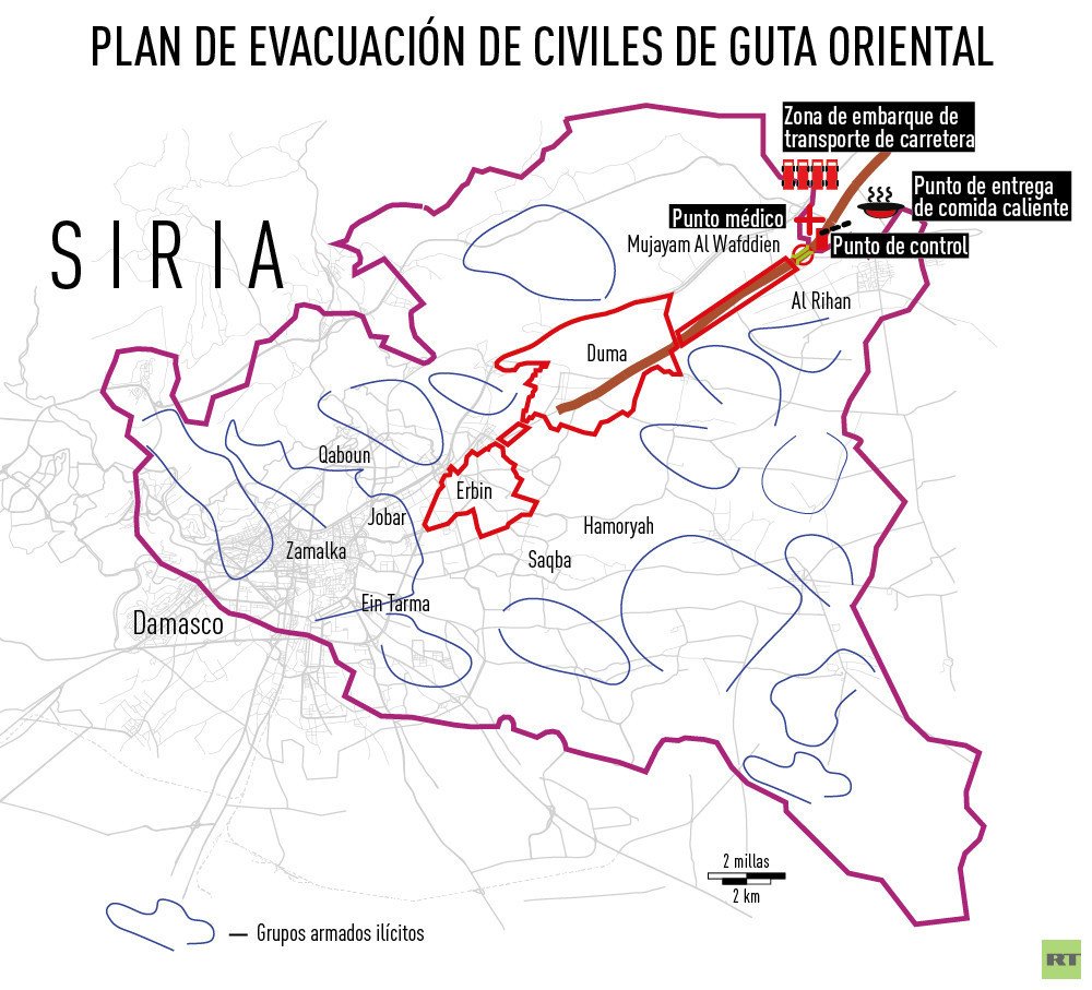 Los culpables son "los terroristas y los comandantes de aquellos grupos armados" que no aprovecharon las posibilidades presentadas por el establecimiento de una zona de distensión en Guta Oriental y no cumplieron los acuerdos logrados en El Cairo en 2017 para separarse de los terroristas y luchar contra ellos. "En vez de eso, decidieron entrar en connivencia con los milicianos de Frente al Nusra, convirtiéndose en su arma de lucha", ha recordado la portavoz.