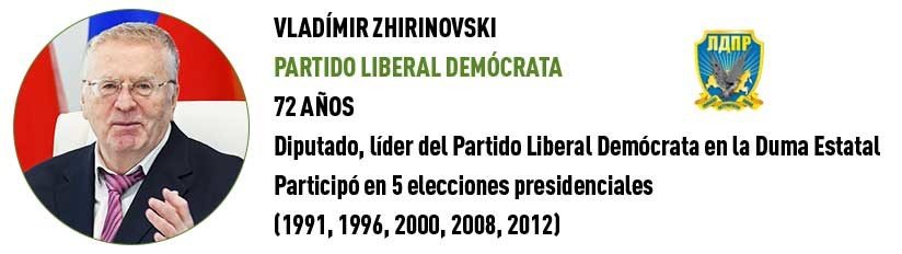 El candidato del Partido Liberal Demócrata y líder de esa formación en la Duma Estatal, Vladímir Zhirinovski, ha participado en cinco elecciones presidenciales desde 1991. Logró su mejor resultado en 2008, cuando obtuvo el 9,35 % de los votos.