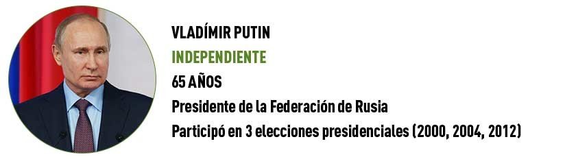 El presidente de Rusia, Vladímir Putin, ejerce su tercer mandato al frente del país desde mayo de 2012 y se presenta como independiente, como sucedió en 2004.