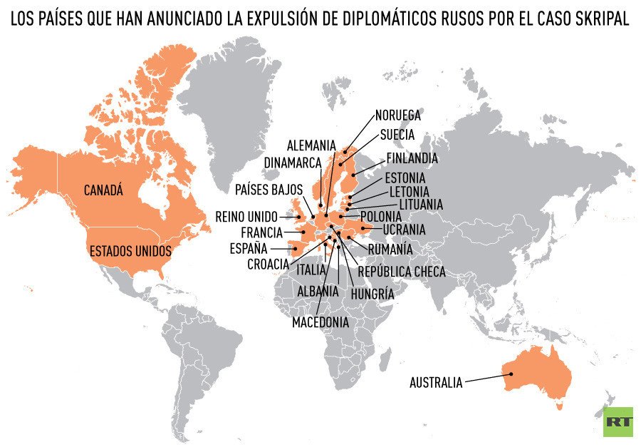 Este 26 de marzo, 15 Estados miembros de la UE han decidido expulsar a diplomáticos rusos del territorio de sus respectivos países en consonancia con las medidas adoptadas por el Reino Unido en el marco del caso Skripal. A estas naciones se han unido EE.UU., Canadá, Albania y Ucrania.