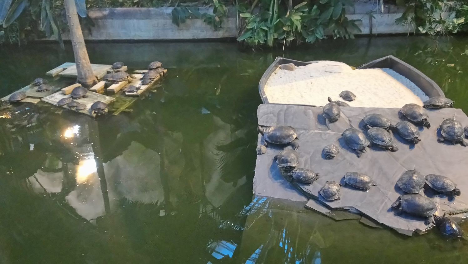 Pocos viajeros conocen el verdadero origen de estos animales, y suponen simplemente que forman parte del jardín de la misma manera que las plantas que lo conforman. Pero no es así: su origen, de hecho, es el abandono ilegal cometido por sus dueños, y su presencia en el estanque empieza a ser un problema.