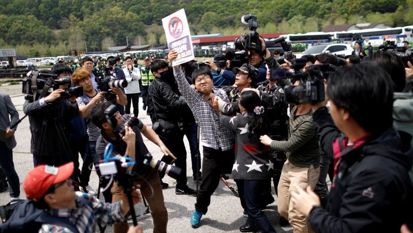 En el lugar también se reunieron cerca de 150 personas que se enfrentaron a los activistas, acusándolos de provocar una confrontación con Pionyang. "Dejen de provocar una guerra", gritaron, según The Korea Times.