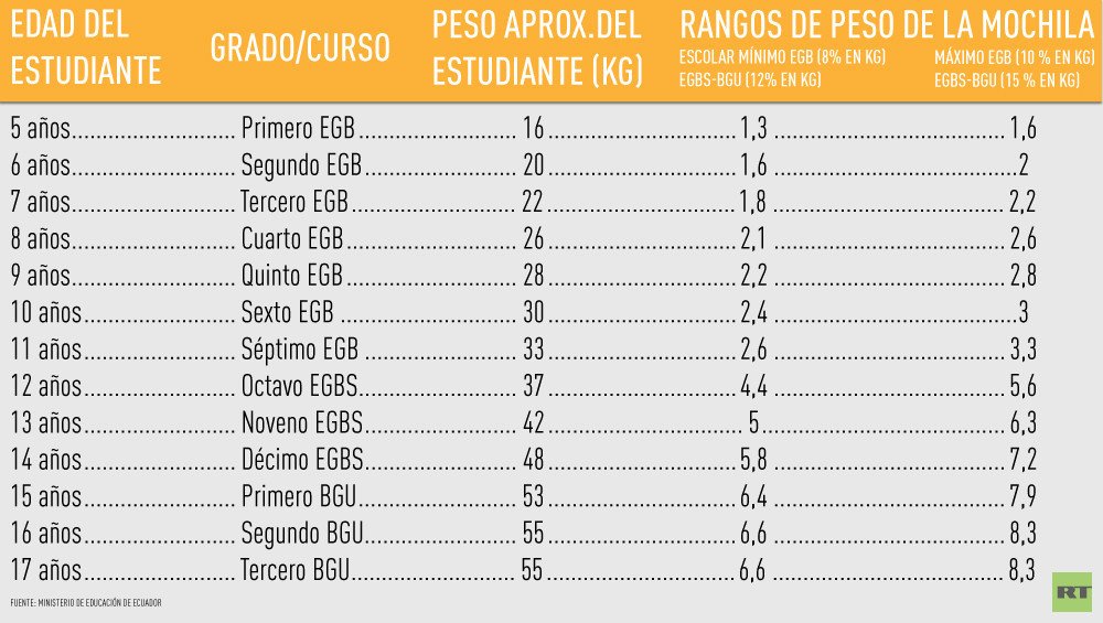 Este jueves, el Ministerio de Educación de Ecuador emitió, por primera vez, una normativa para regular el peso de las mochilas de los estudiantes de Educación General Básica (EGB) y bachillerato General Unificado (BGU), a fin de proteger su salud y evitar que sufran lesiones musculares y articulares en la espalda.
