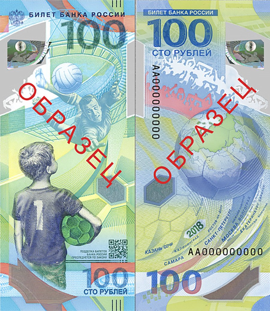 El Banco de Rusia ha presentado los billetes conmemorativos de 100 rublos (unos 1,6 dólares) dedicados al Mundial 2018. La tirada total es de 20 millones de ejemplares.