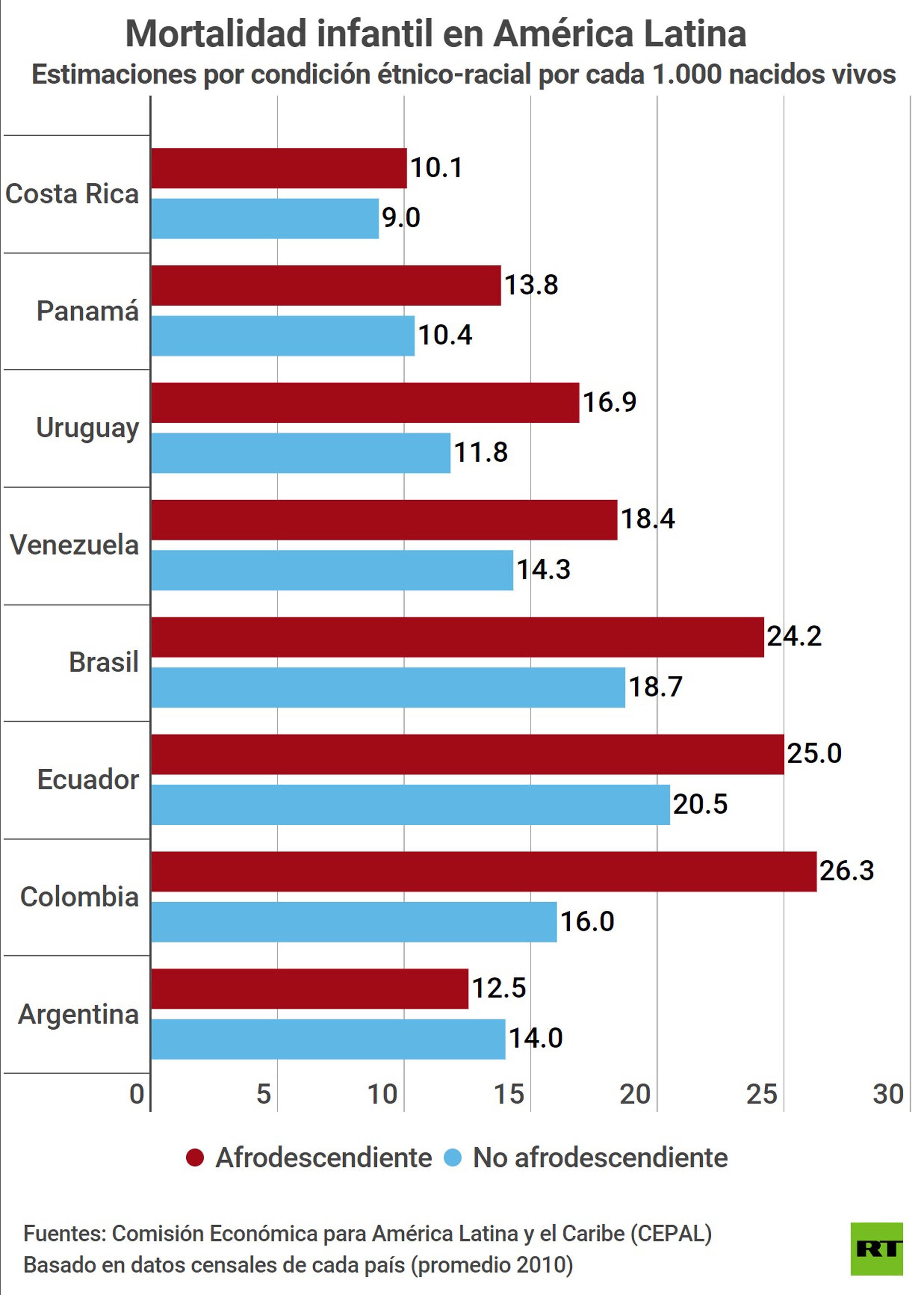 Los índices de niños que mueren antes de cumplir el año de vida también son mucho más altos en pequeños afrodescendientes. En Colombia se da la diferencia más grave: de 1.000 infantes blancos, 16 fallecen, pero si el mismo criterio se usara con 1.000 niños afros, las muertes aumentan a un promedio de 26,3. En Ecuador la mortalidad alcanza una media de 20,5 pequeños de piel blanca y 25 afrodescendientes.