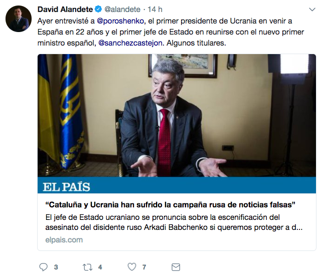 El periódico español El País vuelve a hacerse eco de la presunta campaña de noticias falsas que estaría llevando a cabo Rusia para desestabilizar a algunos países. En esta ocasión, ha sido la visita del presidente ucraniano, Piotr Poroshenko, a España y su encuentro con el presidente Pedro Sánchez la que ha dado lugar a una entrevista al líder ucraniano centrada en Rusia y, sobre todo, en sus medios de comunicación.