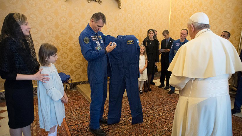 Durante una reunión en el Vaticano con el papa Francisco, unos astronautas de la Estación Espacial Internacional han regalado al sumo pontífice su propio traje espacial. El traje es de color azul y lleva el nombre secular del papa, Jorge Bergoglio, y la bandera de Argentina. Además, le han añadido una pequeña capa blanca, en la que aparece la bandera del Vaticano, el logo de la NASA y las palabras "papa Francisco".
