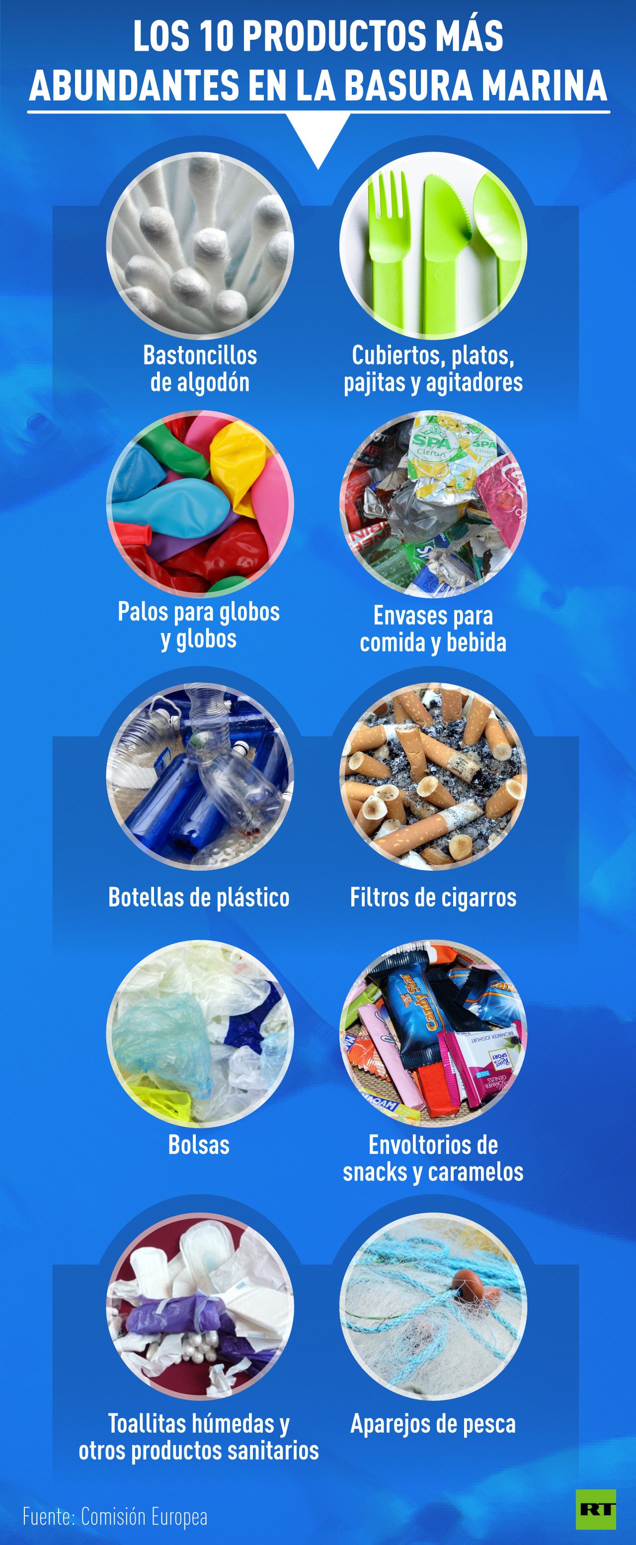 Se estima que los diez productos identificados constituyen el 70% de todos los residuos que se encuentran en las aguas marinas. En total, los plásticos son el 85% de la basura oceánica.