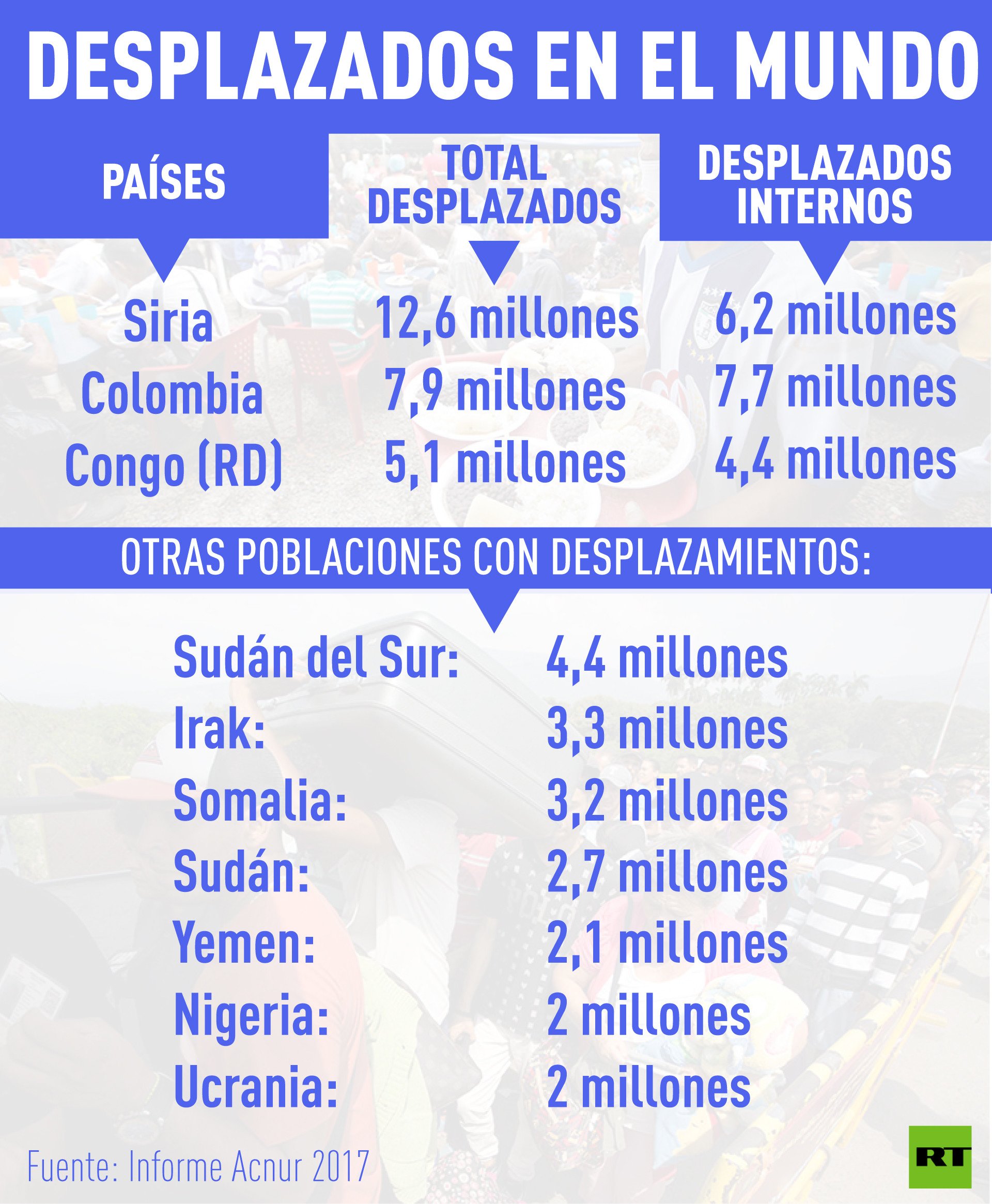Colombia figura como el país con más desplazados internos del mundo durante 2017, con 7,7 millones de personas, según consta en el último Informe del Alto Comisionado de las Naciones Unidas para los Refugiados (Acnur), titulado 'Tendencias Globales 2017'.