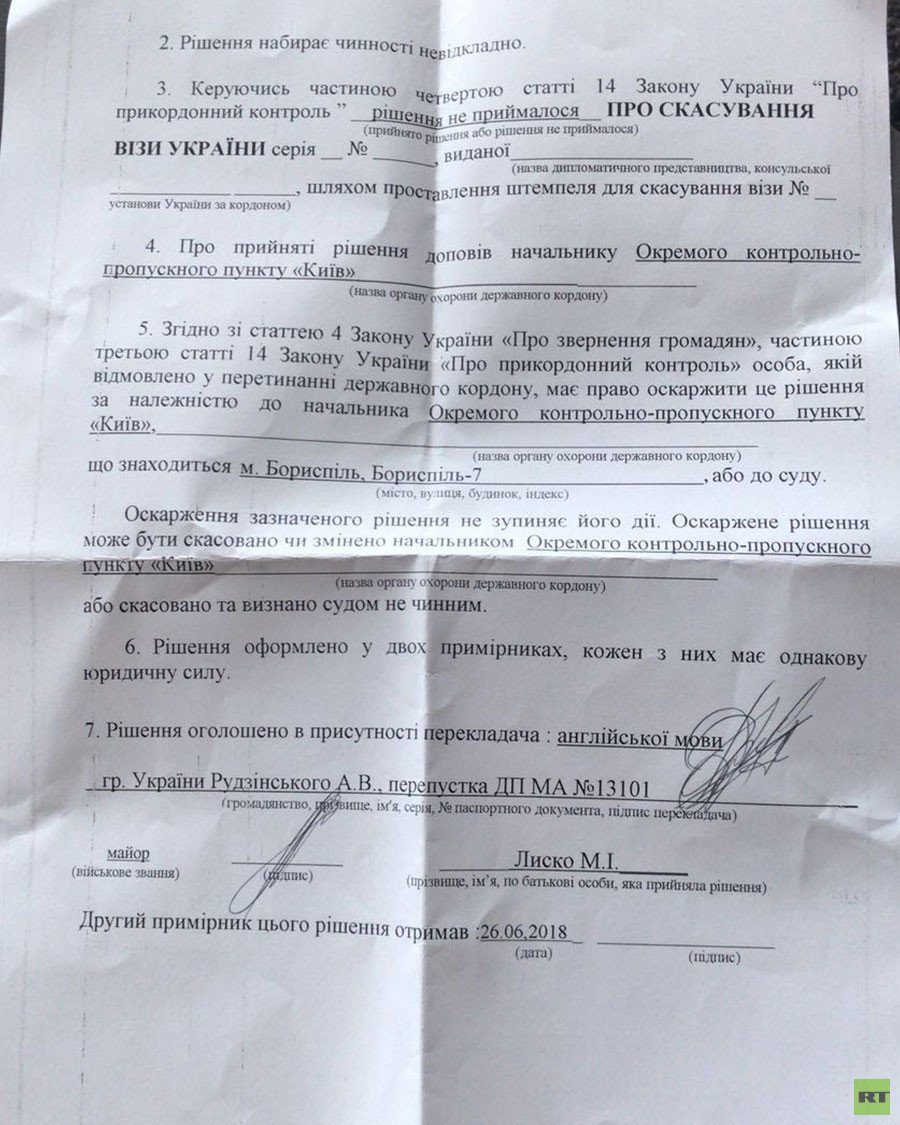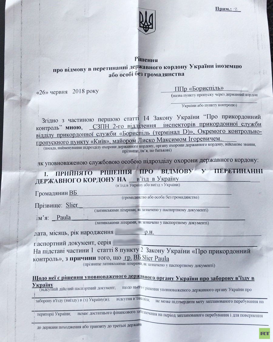 Las autoridades aduaneras del aeropuerto internacional de Kiev han pedido a Slier firmar unos documentos para su deportación y le han informado de que se le prohíbe la entrada al país durante cinco años.