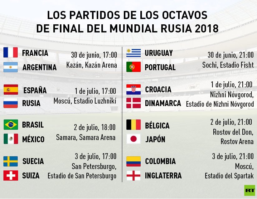 A partir de este sábado, el Mundial Rusia 2018 entra en su fase decisiva. Conozca todos los cruces, horarios y lugares de los enfrentamientos de los octavos de final.