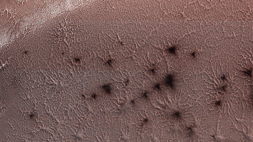 La nave espacial Mars Reconnaissance Orbiter de la NASA fotografió el pasado 13 de mayo cómo en la superficie de Marte comenzaron a surgir sus peculiares 'arañas'. Una imagen tomada en el Polo Sur durante el invierno marciano muestra el planeta rojo cubierto por una capa de hielo de dióxido de carbono.