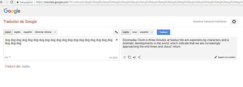 Por ejemplo, si uno escribe la palabra 'dog' 19 veces y pide al Google traducir del maorí al inglés, el resultado que aparece es un texto auténticamente apocalíptico: "El Reloj del Juicio Final es de tres minutos para las doce. Estamos experimentando personajes y desarrollos dramáticos en el mundo, lo que indica que nos estamos acercando cada vez más al final de los tiempos y al regreso de Jesús".