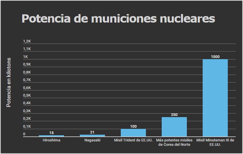 Hagamos ahora una comparación entre las bombas lanzadas en Hiroshima y Nagasaki al final de la Segunda Guerra Mundial, los actuales misiles nucleares estadounidenses de largo alcance y la primera detonación termonuclear realizada por Corea del Norte el año pasado. Las siguientes figuras muestran en kilotones de equivalente de trilita: