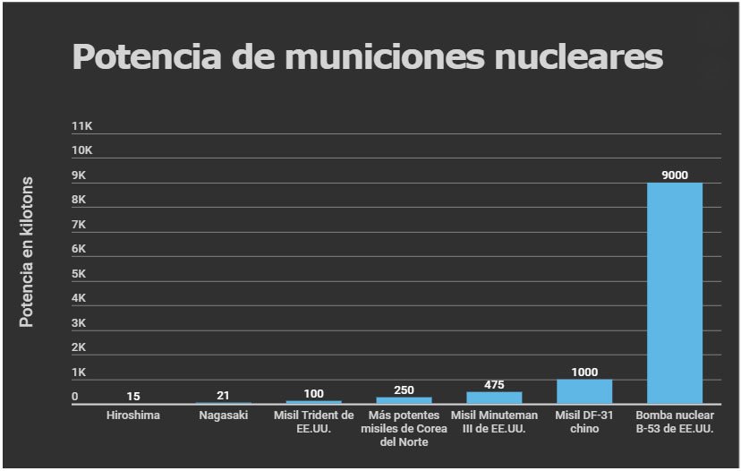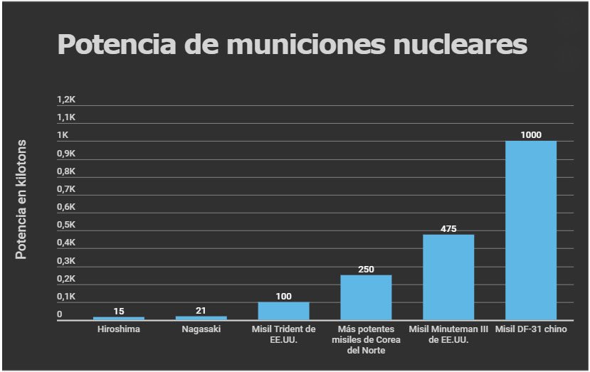 Ese gráfico parece indicar un aumento significativo en el rendimiento destructivo de estas armas desde su primer (y único) uso en combate hace más de setenta años. Sin embargo, el caballo de batalla estadounidense Minuteman III, activo desde 1970, aunque con ciertas actualizaciones, no puede ser comparado con los últimos portadores de cargas nucleares de China y Rusia (aunque EE.UU tiene un as guardado en la manga en forma de bomba nuclear extremadamente poderosa llamado B53).
