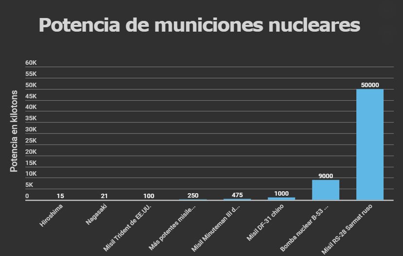 Al comparar el rendimiento explosivo de las bombas atómicas lanzadas sobre Hiroshima o Nagasaki con el arma nuclear más poderosa de Rusia, el RS-28 Sarmat, se obtiene una mancha demasiado pequeña como para poder comparla en relación con el nuevo misil balístico ruso. La comparación entre el RS-28 y los misiles nucleares Trident, lanzados por submarinos estadounidenses, produce casi el mismo resultado, a pesar de que estos pueden multiplicar por seis el poder destructivo de la bomba lanzada sobre Hiroshima.
