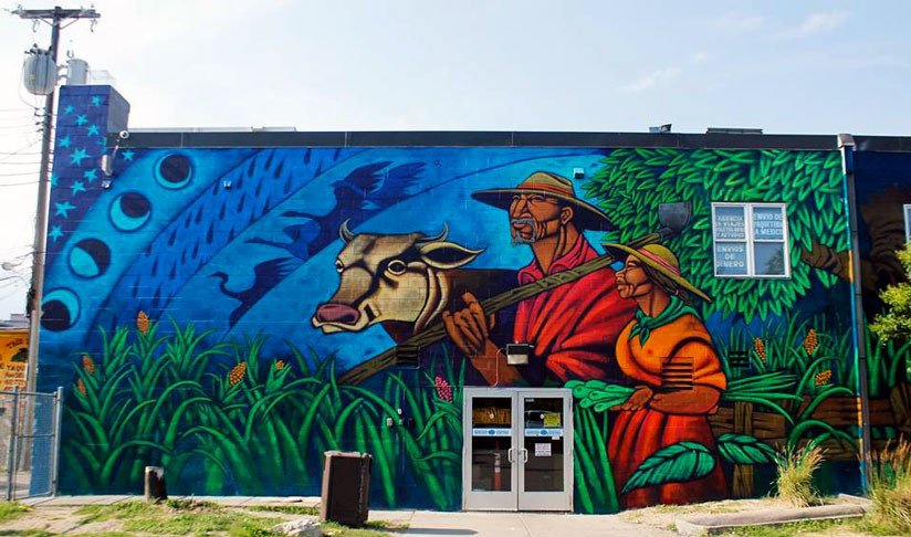 La primera parte del mural que el artista pinta en suelo estadounidense traza un campo para el cultivo de alimentos. La segunda, explicará el mercado como espacio cultural. La tercera, representará a la comunidad que hace parte del mercado. Luego, una 'Pacha Mama' (madre tierra) huichol, en homenaje al pueblo indígena mayoritario en el estado de Nayarit, México. Por último, la imagen de una familia que representa varias etapas de la historia mexicana.