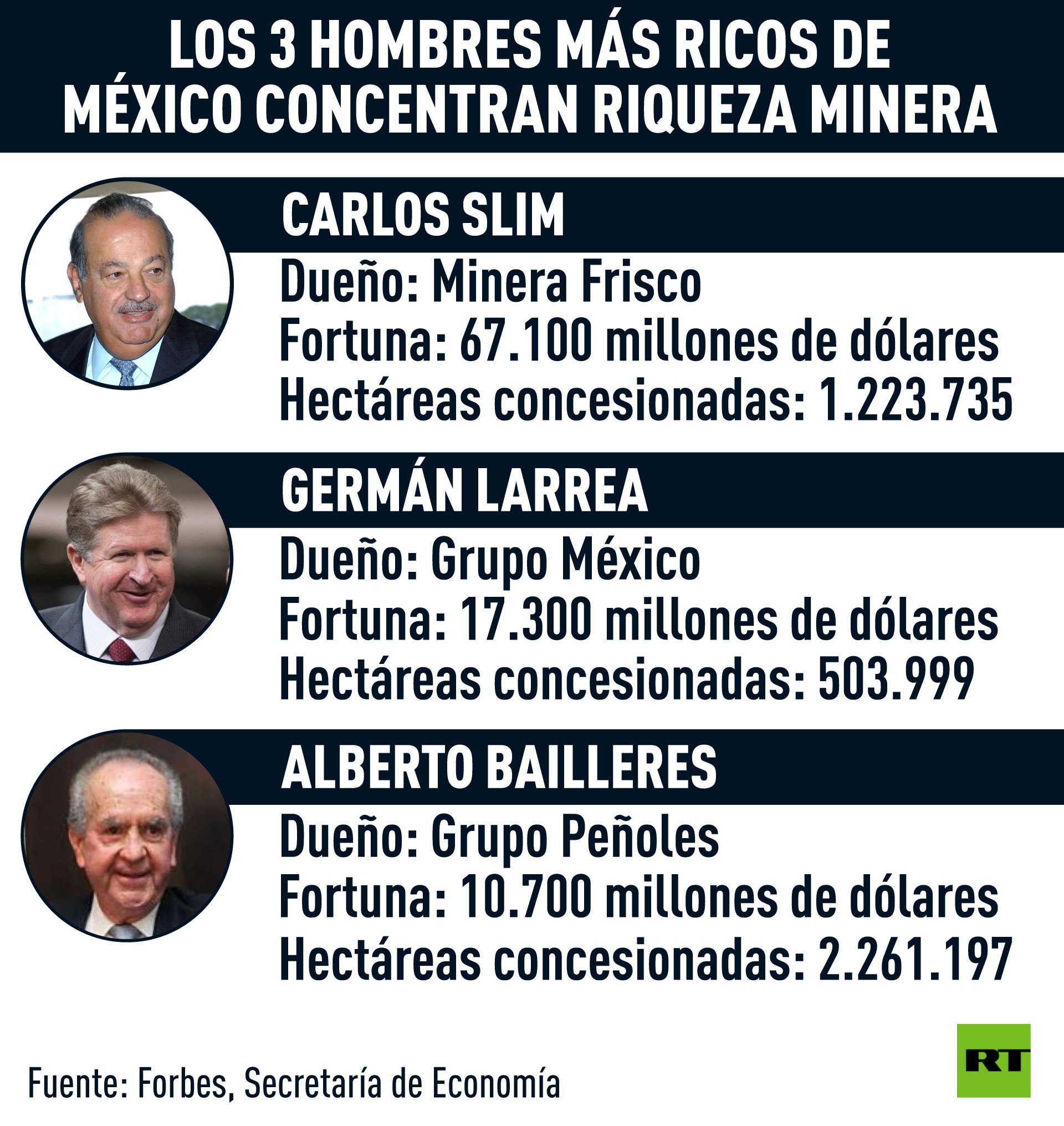 Datos de la Secretaría de Economía sostienen que desde el sexenio del presidente Carlos Salinas de Gortari los magnates Slim, Larrea y Bailleres han recibido 2.218 concesiones mineras en todo el país, controlando casi 4 millones de hectáreas para explotación de minerales, equivalentes al 2% de la plataforma continental que integra el territorio mexicano.
