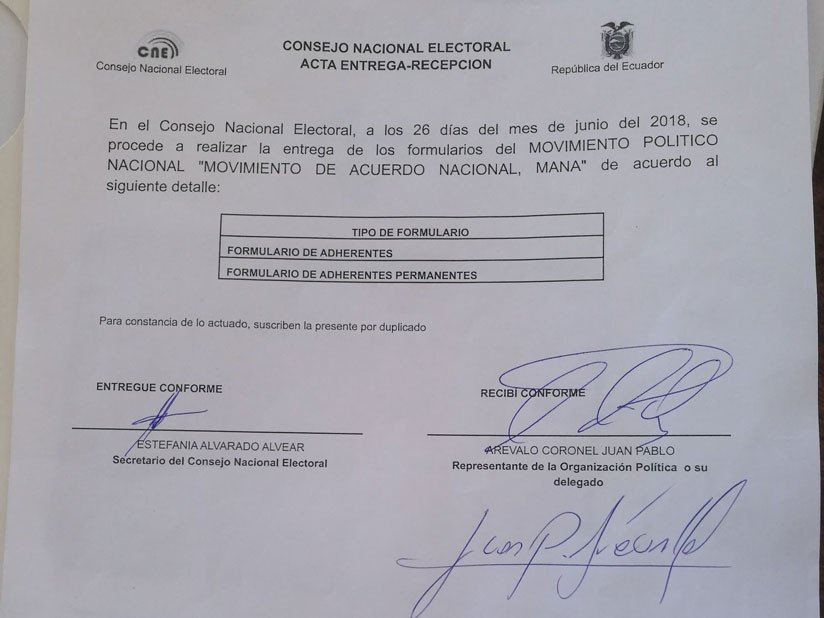 Arévalo demuestra que es el representante ante la organización al presentar un documento del ente electoral, donde le hacen entrega de los formularios para la recolección de firmas, necesaria para concretar la inscripción. Asimismo, muestra que puede ingresar a la página web del CNE para imprimir esos formularios de adhesiones, acceso que solo dan a los representantes legales de los movimientos y partidos políticos.