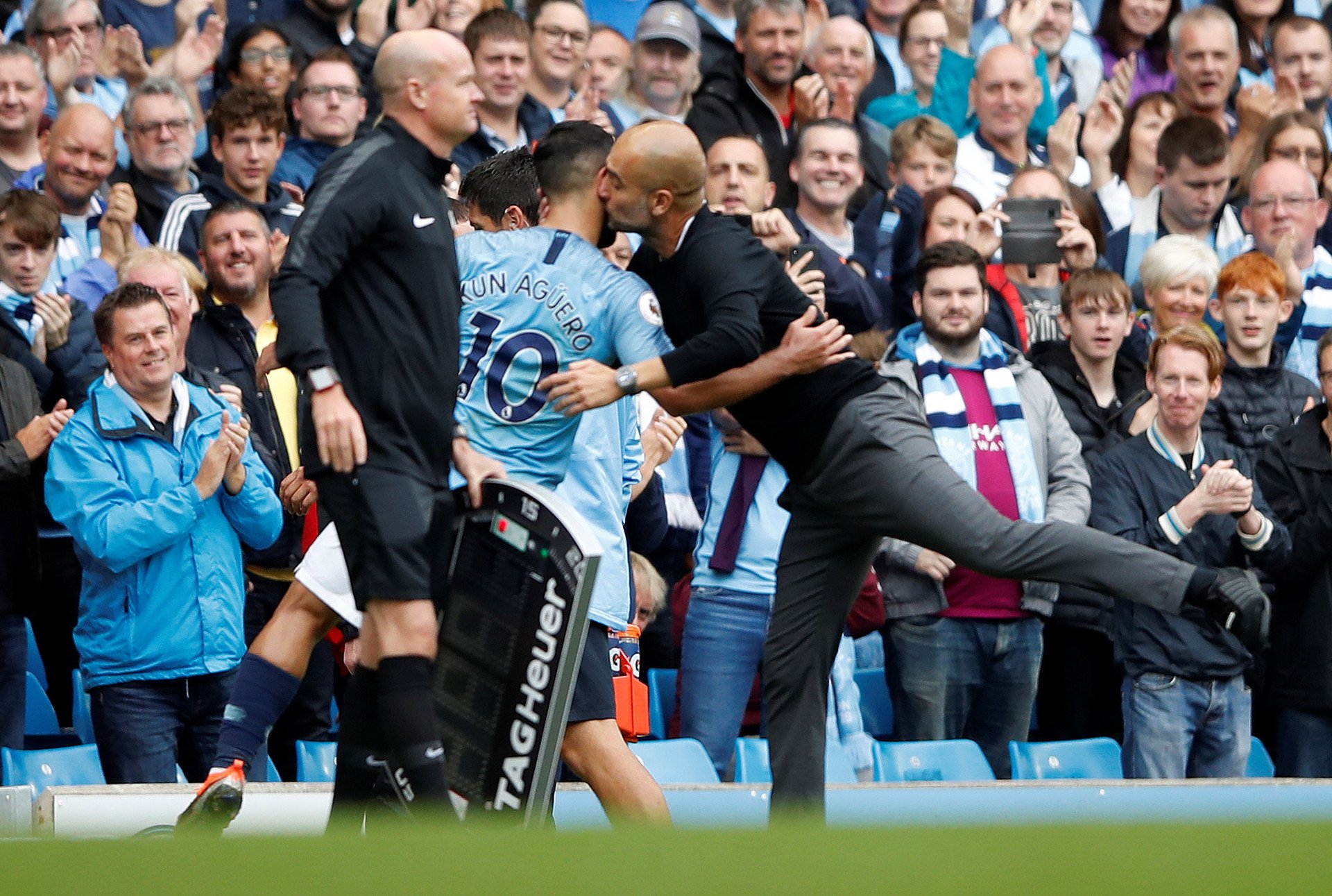 El delantero argentino del Manchester City Sergio 'Kun' Agüero se convirtió este domingo en la figura de la victoria 6 a 1 sobre el Huddersfield Town, en la segunda fecha de la Premier League de Inglaterra. Y es que no solo su triplete la valió la ovación del público, sino también un emotivo beso del técnico Pep Guardiola que se hizo viral en la Red.