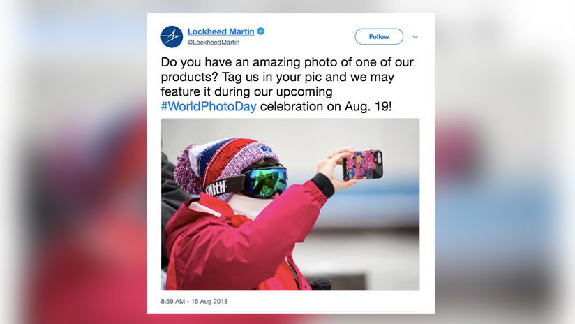 La compañía estadounidense Lockheed Martin, contratista de Defensa y mayor fabricante de armas del mundo, recibió una lluvia de críticas la semana pasada a raíz de la publicación de un tuit con motivo el Día Mundial de la Fotografía.