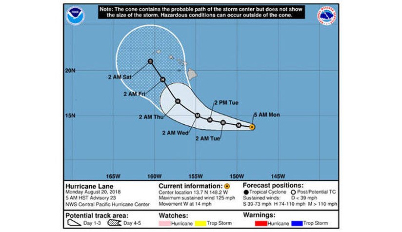 El huracán Lane de categoría 3 podría acercarse peligrosamente a las islas de Hawái esta semana, según informan medios locales. Este lunes, Lane continuó fortaleciéndose en las aguas del Pacífico Central con vientos sostenidos de 200 kilómetros por hora y ráfagas aún más fuertes.