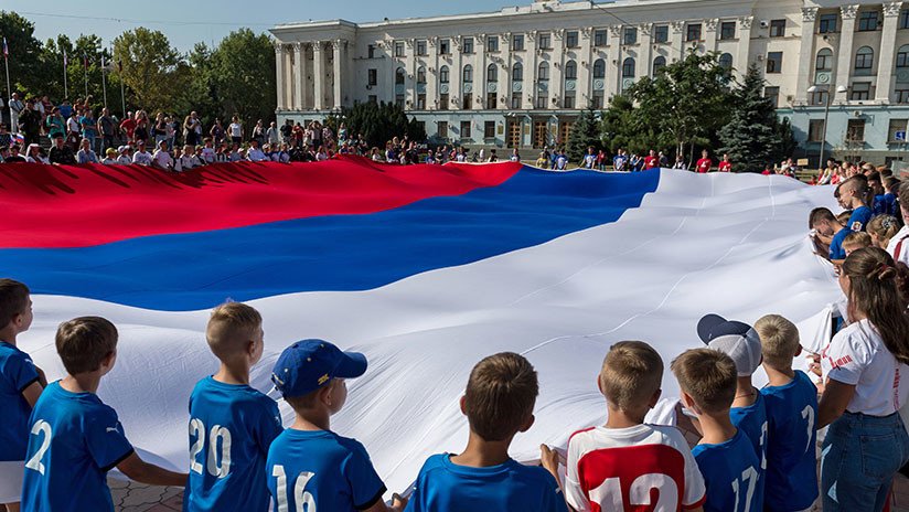 En la plaza central de la ciudad de Simferópol, en Crimea, ha sido desplegada este miércoles la mayor bandera rusa de la península, informa la agencia TASS. El emblema mide 28 metros de largo y 16 de ancho y pesa 100 kilógramos. La iniciativa se enmarca en el Día nacional de la bandera rusa.