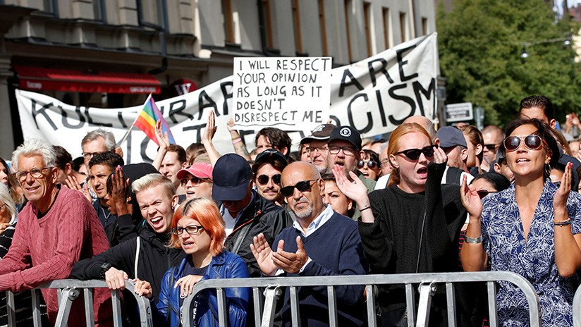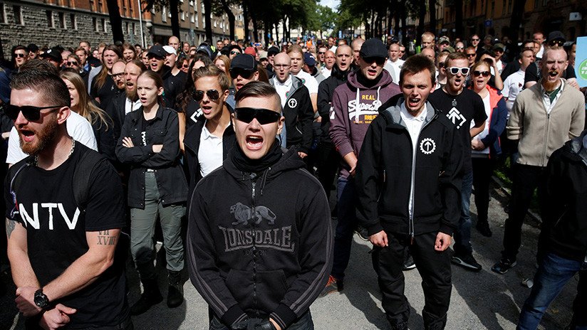 Militantes del grupo neonazi Movimiento de Resistencia Nórdico (NRM, por sus siglas en inglés) se manifestaron este sábado en Estocolmo, Suecia. La reunión también atrajo a muchos contramanifestantes, que se reunieron para protestar contra el odio propagado por los primeros.