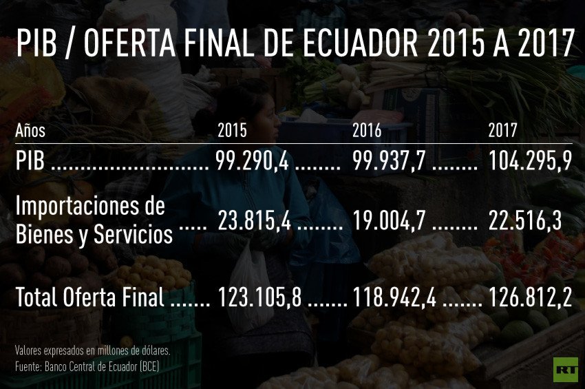 De acuerdo a los datos oficiales del Banco Central del Ecuador (BCE), el PIB del país cerró en 2017 en 104.295,9 millones de dólares, un monto superior a los 99.937,7 de 2016 y los 99.290,4 de 2015. Lo mismo pasa con la Oferta Final, que en 2017 cerró en 126.812,2 millones de dólares, mucho más que los 118.942,4 de 2016 o los 123.105,8 de 2015.