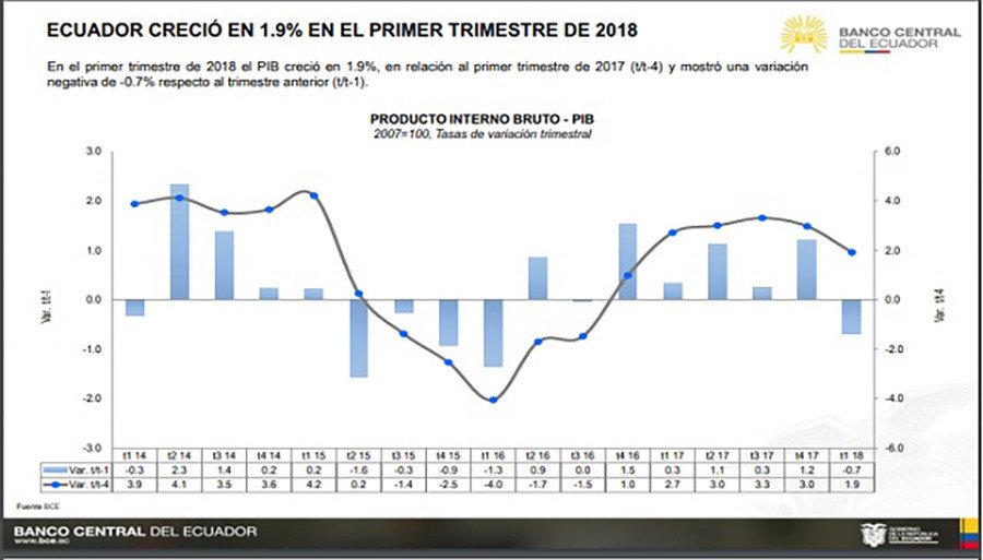 El BCE también informó que en el primer trimestre de 2018, el PIB creció un 1,9 % en relación al mismo lapso de 2017.